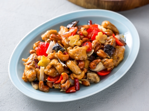 中国料理の鶏肉のカシューナッツ炒め「腰果鶏丁」をアレンジ、とろっと昆布のうまみが絡むまろやかな味わいの「ヤマサ おまかせ酢」でジュワッとコーティング。