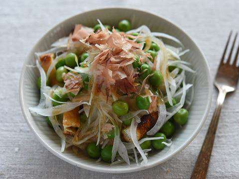 新玉ねぎ、グリーンピース、こんがり焼いた油揚げ、3つのシンプルな具材でサラダを作ります。