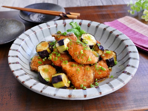 衣を付けてサックリ揚げた鮭に「ヤマサ まる生W(ダブル)おろしぽん酢」と刻みねぎをたっぷりかけて油淋鶏風に仕上げました♪素揚げしたなすも加え食感の違いも楽しみます☆