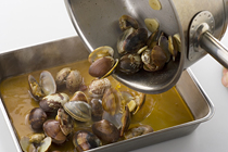 中火で煮たて口が開いたら火を止め、バットに開けます。