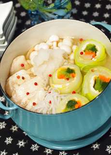 「ヤマサ昆布つゆ白だし」のお味と素材から出る旨みで、体が温まるヘルシーな煮鍋です。昆布だしのやさしい色を、冬の食材と共に表現しました。お揚げや塩麹の柔らかチキンからも味が出て美味しいお鍋になりました。