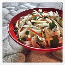 - ボウルに水気をしぼった大根とわかめ、水気を切ったりんごを合わせて混ぜ、器に盛り付けてごまをちらす。