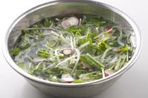 ほうれん草は3センチ長さに切り、玉ねぎは繊維を立つように薄切り、 ラディッシュは薄切りにして、一緒に水にさらす。
