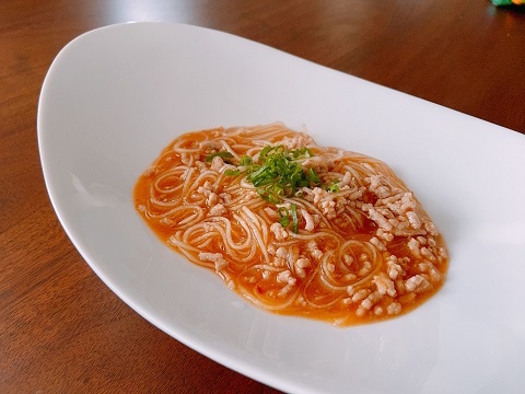 - フライパンを中火にかける。豚挽き肉に火が入り、春雨が柔らかくなり、とろみがついたら皿に盛る。