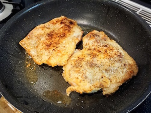 - フライパンにサラダ油を多めに入れて中火にかけ、STEP1を皮目から焼く(余分な粉は落として入れる)。じっくりめに焼いてしっかりと焼き色を付けたらひっくり返し、ふたを少しずらすように閉めて、弱火で8~9分ほど蒸し焼きにする。ふたを少しずらすのは、焼いた面のカリカリ具合をできるだけキープするためです。