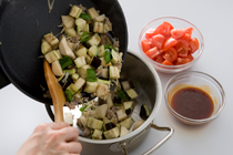フライパンにサラダ油大さじ1をひき、4つに切ったにんにくを加えて中火で熱します。香りが出てきたら豚ひき肉を炒め、STEP1のエリンギ、えのき茸、ピーマンを炒め、サラダ油大さじ2をたして、なすを炒めます。