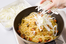 STEP1のスパゲティをSTEP3に加え、強火で炒め、火を止め、STEP1の長ねぎと白ごまを加えて盛りつけます。 レモン汁をふりかけていただきます。