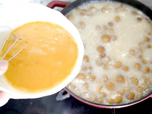 沸騰したら弱火にし、水溶き片栗粉を入れとろみをつけ、卵を溶いて回し入れる。かいわれ大根と粗びき黒こしょうを適量トッピングする。