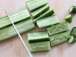 きゅうりは麺棒などで叩いてから縦半分、横3等分に切る。