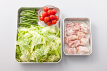 鶏もも肉は一口大に切る。キャベツは大きめの角切りにし、いんげんは2~3等分に切り、ミニトマトはへたをとる。