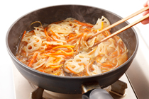 玉ねぎは薄切り、レンコンは半月の薄切り、にんじんはせん切りにする。