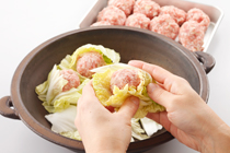 鍋にSTEP2の白菜の葉で包んだSTEP1の肉だねを間隔をあけてのせる。空いているところにSTEP2の白菜の芯としいたけを詰める。酒と水をまわしかけて中火にかけ沸騰してから、弱火にして20分ほど蒸す。「ヤマサ昆布ぽん酢」とお好みでからしをつけていただく。